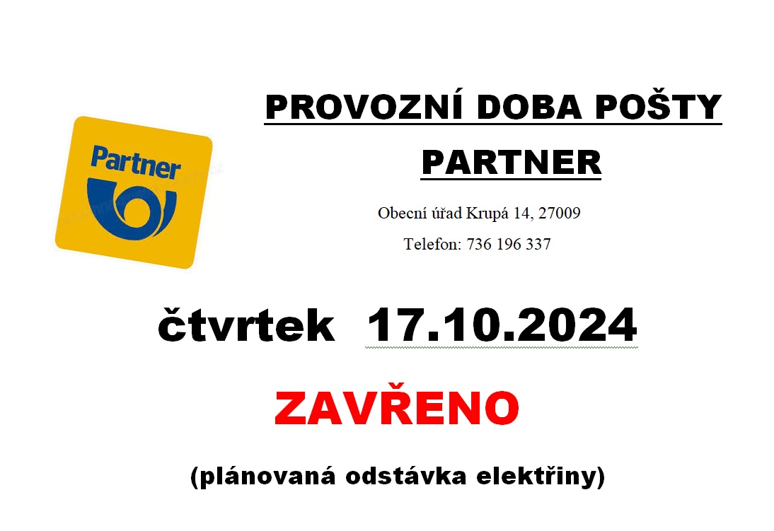 čtvrtek 17.10.2024 bude pošta Partner Krupá uzavřena z důvodu plánované odstávky elektřiny